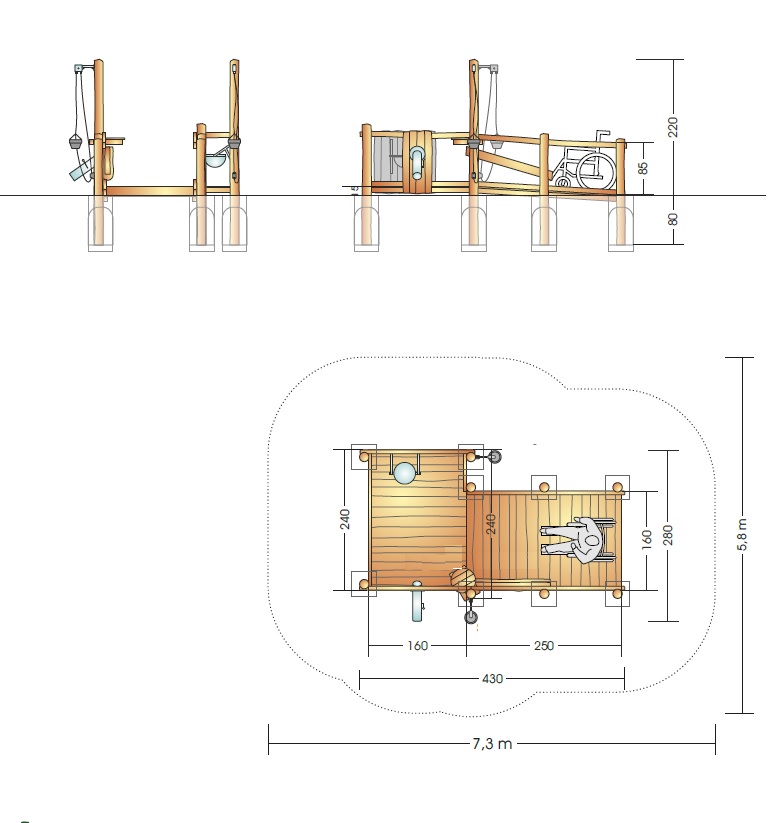 - piattaforma 2,40 x 1,60 m, h da terra ca. 15 cm, completa di balaustre;
