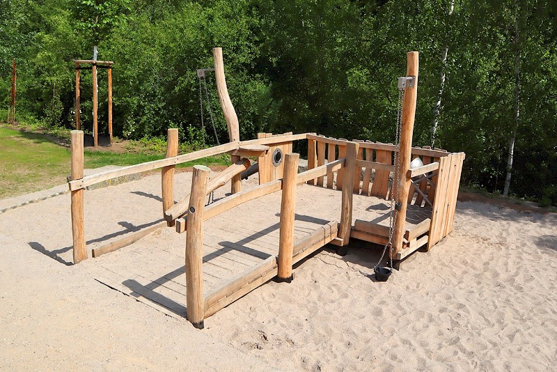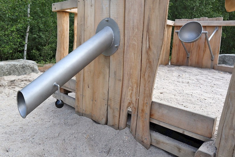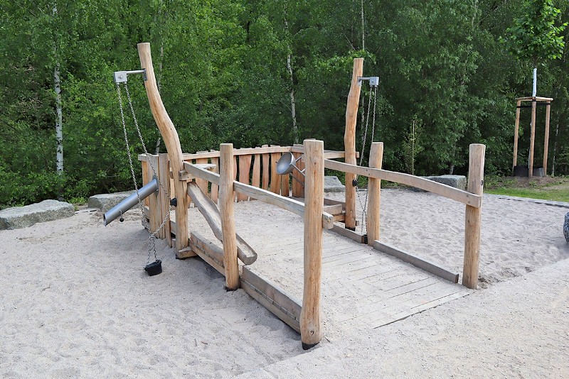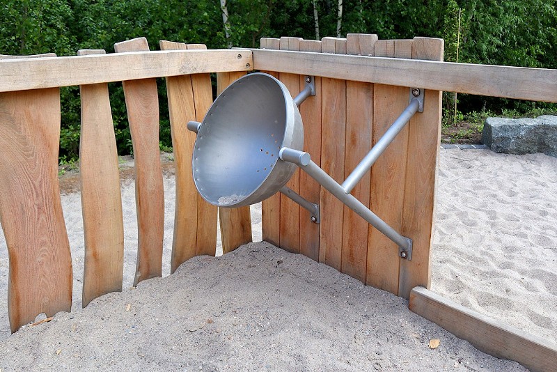 - Struttura inclusiva e accessibile per il gioco con la sabbia realizzata interamente in legno massello naturale di robinia.
