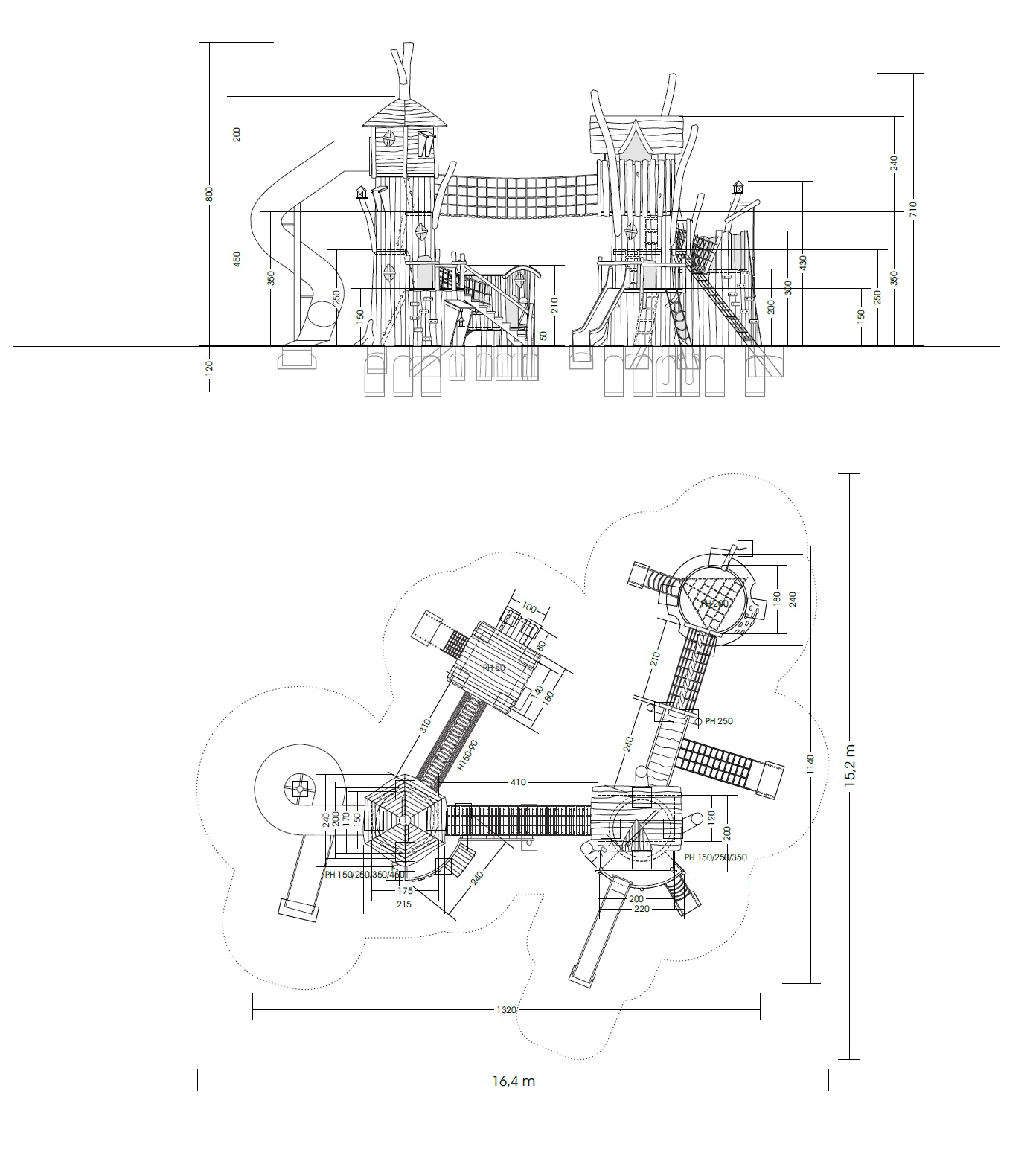 Grande struttura ludica composta da 4 grandi torri di forma diversa, collegate tra loro con ponti, passerelle e altri dispositivi, come da disegni e schizzi. Realizzata interamente in legno massello naturale di robinia accuratamente levigato e lavorato artigianalmente. Sviluppo del progetto in base alle esigenze del cliente.