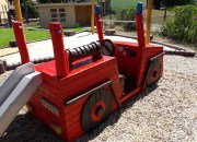 - Riproduzioni artigianali in legno delle seguenti parti: cruscotto,volante girevole, pedale, 4 ruote fisse, fari anteriori e posteriori, targa , avvolgitubo, lampeggianti.