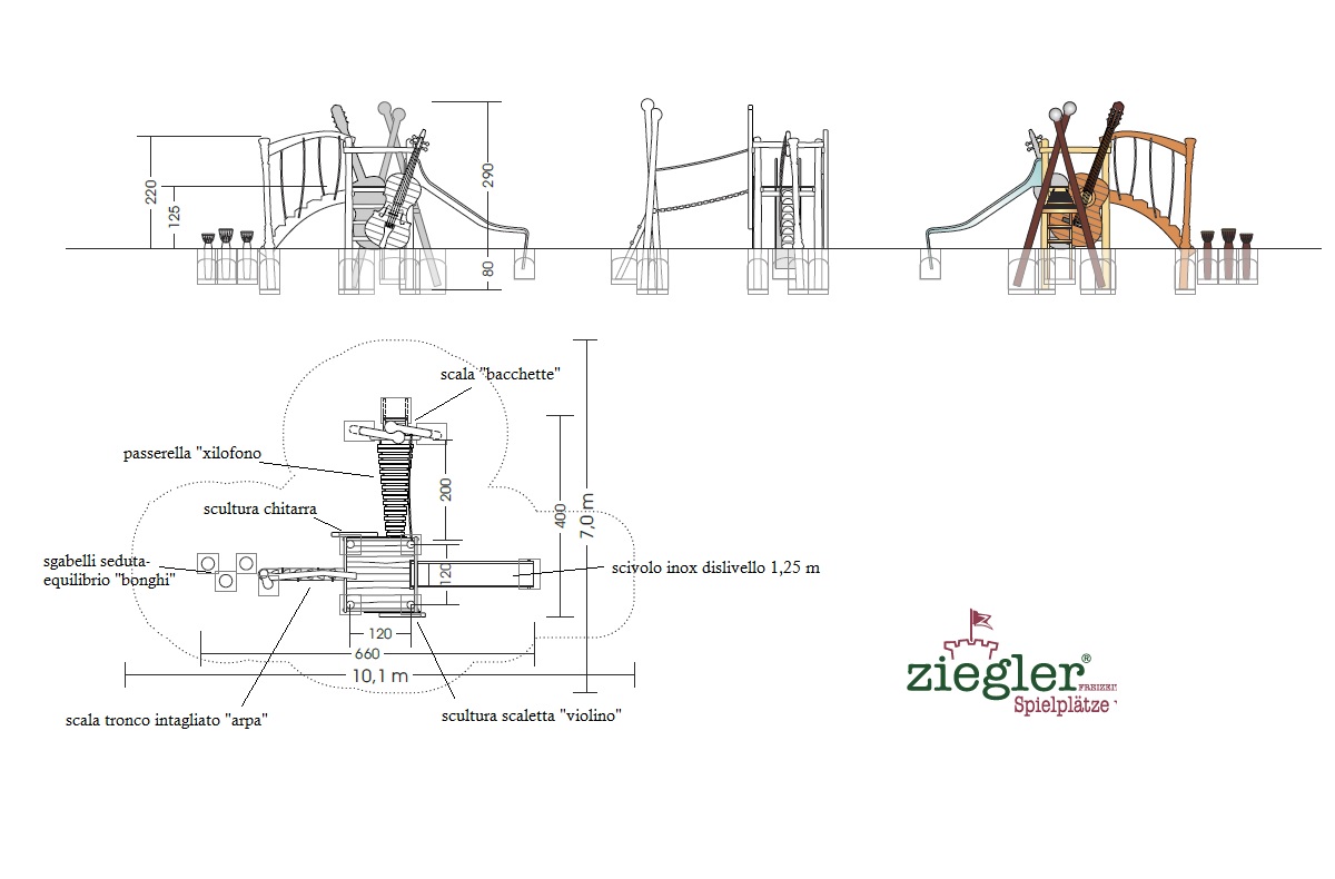 - Ingombro complessivo circa Ø 15 m (con tutti i componenti), solo gioco orchestra 10,10 x 7,00 m;